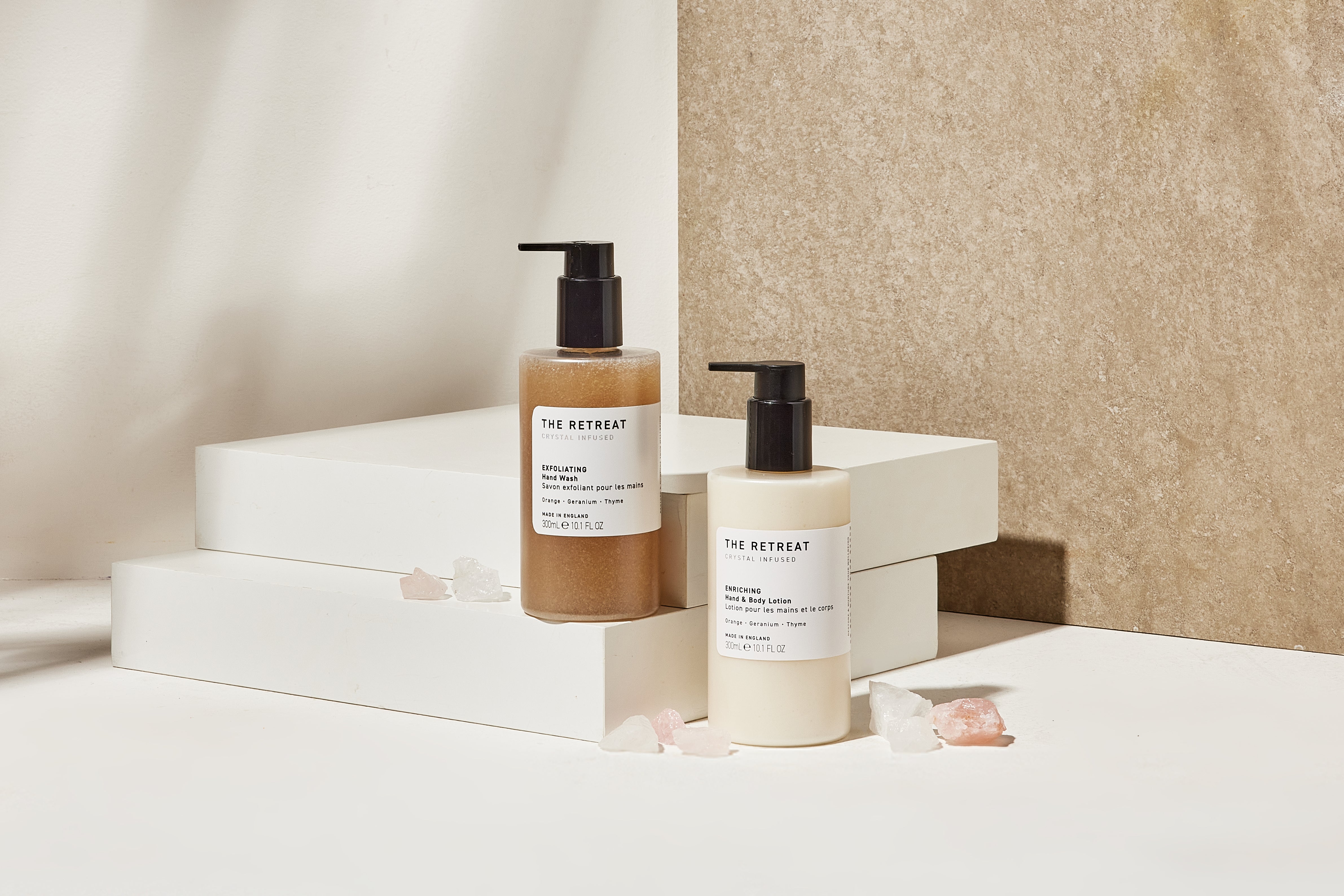 We are The Retreat — a spa-inspired bath and body range designed to transform your daily routine into moments of calm and restoration. Our products combine a unique blend of 10 essential oils, natural formulations, and a signature Rose & Clear Quartz crystal infusion — all thoughtfully crafted to enhance your wellbeing.